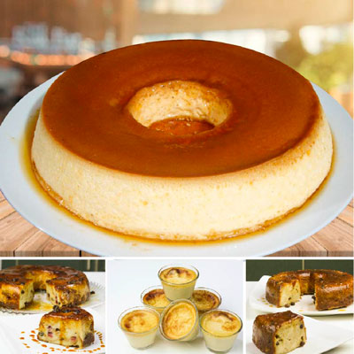 de choclo dulce y budines en tres variedades: budín de pan clásico, budín de panetón y